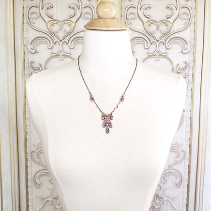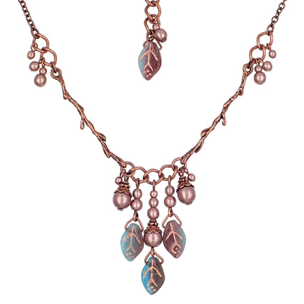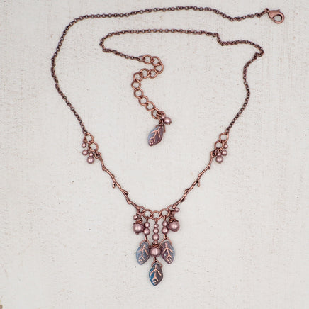 This handmade necklace features beautifully detailed antiqued copper branches paired with clusters of limited-edition artisan Czech glass leaf beads. Each bead is a swirly mix of transparent purple, transparent teal, and opaque aqua blue glass with a metallic copper wash in the veins of the beads. I finished the clusters with metallic Czech glass faux pearl beads.