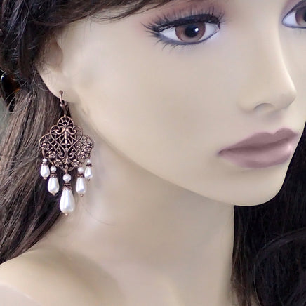 Antique Style Filigree Chandelier Earrings with White Pearls