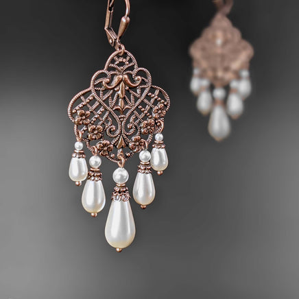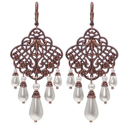 To make these antique-style chandelier earrings, I used exquisitely detailed European filigree, round Austrian crystal pearls, and Czech crystal drop-shaped pearls in 3 sizes. The metal has been professionally finished in an antique copper patina, which brings out the delicate details in the filigree and bead caps.