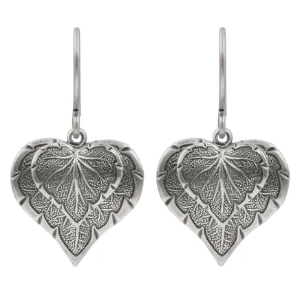 These handmade earrings feature beautifully detailed heart-shaped leaves in an antiqued silver finish. The antiquing brings out the intricate veining in the leaves.