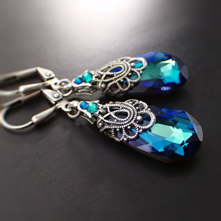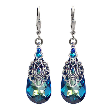 Bermuda Blue crystals dressed with intricately detailed antique silver filigree. The earrings are adorned with matching crystal stones and dangle from lever back ear wires for added security.