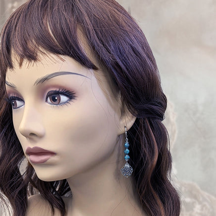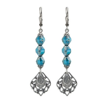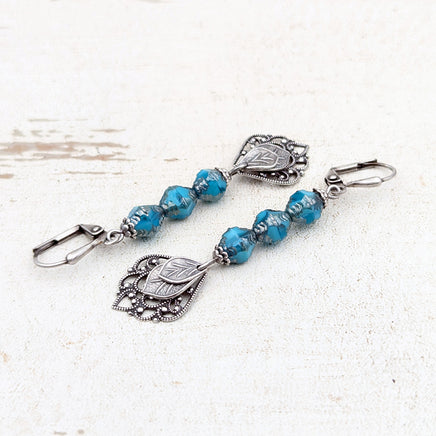 These handmade earrings feature artisan-made Czech glass faceted blue bicone beads paired with antique silver filigree and leaf details. The beads are mix of opaque and transparent turquoise blue glass and have have a shimmery silver finish on the edges to coordinate with the metal. The antique silver leafy accents give these earrings a vintage, boho-inspired look.