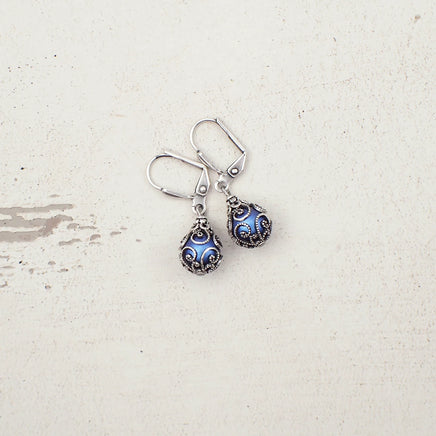 Dark Iridescent blue crystal simulated pearls caged within vintage style antiqued silver filigree.