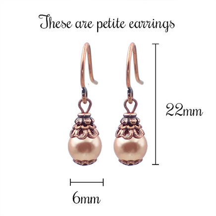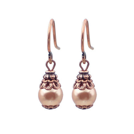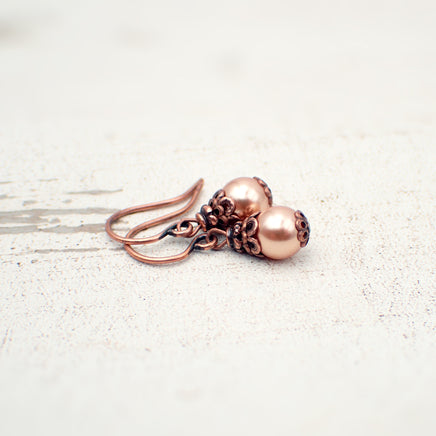 Dainty little rose gold-colored crystal pearls dressed with antiqued copper details.