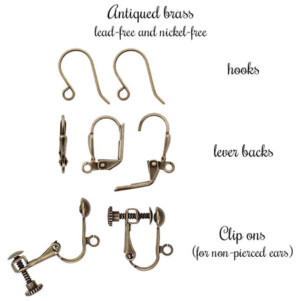 - All styles of ear wires are antiqued brass, lead-free and nickel-free. Available styles are hooks, lever backs, and clip ons (for non-pierced ears)