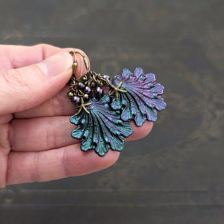 These handmade earrings feature detailed scalloped seashells with an enchanting color-shifting iridescent finish in dark purple and green tones. Accented with a small antiqued brass starfish, coordinating antiqued brass beads, and sophisticated iridescent Austrian crystal pearls, the design brings a touch of ocean-inspired magic to your look. Lightweight and bold, they’re perfect for beach lovers, witchy mermaid styles, or anyone who wants to add a little shimmer to their day.