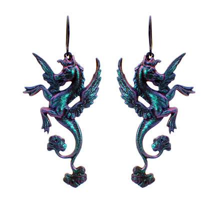 Victorian Gothic style mythical seahorse stampings featuring a color-shifting patina in shades of deepest purple and green. The color shifts as the angle from which you view them changes.