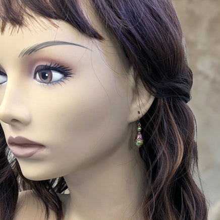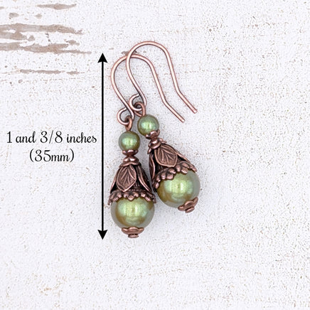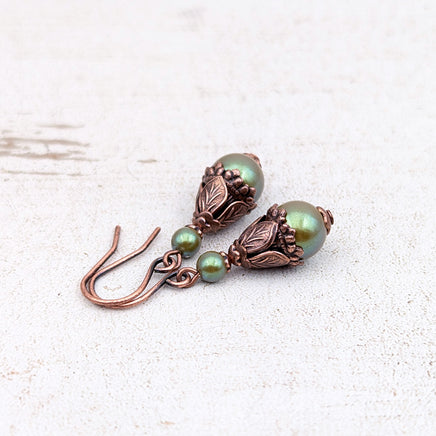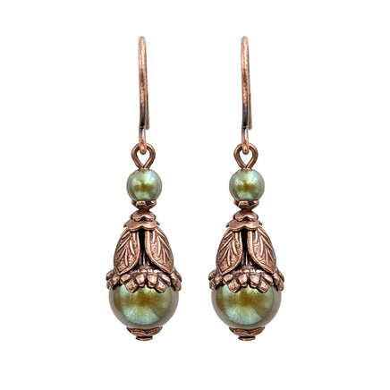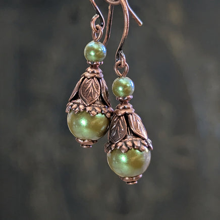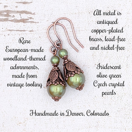 These nature-inspired handmade earrings feature crystal pearls in an iridescent green color, which is a shimmering light green in the middle with an orange-ish color around the edges, giving them an overall iridescent olive green appearance. I paired the earthy tones with woodland-themed antiqued copper leafy adornments caps and findings for a vintage feel. The caps are beautifully detailed rare finds and were made in Europe from vintage tooling.