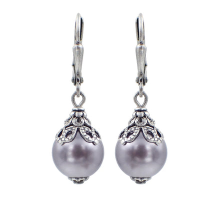 Soft lavender-hued crystal pearls dressed with antiqued silver filigree and adornments for an antique feel.