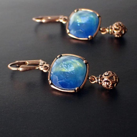 These earrings are made with extremely rare Czech glass stones paired with antiqued copper filigree beads. The stones are made of a silky blue and teal glass multi-colored moonstone, as well as a striking blue dragon's breath effect (that is the little fleck texture that you see in the pictures, with the light hitting at the right angle it sparkles a bright blue). I did my best to capture the effect, it is truly captivating in person.