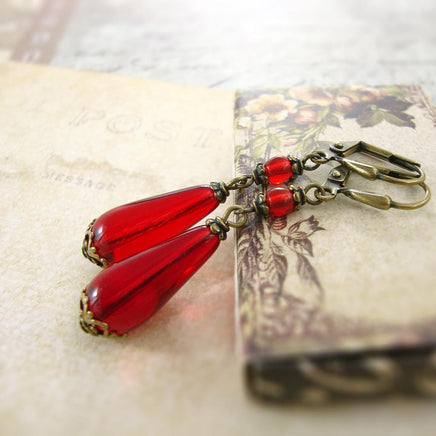 Romantic ruby red Czech pressed glass beads adorned with romantic Victorian style details.