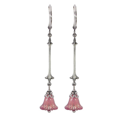 Sleek antiqued silver Art Nouveau components paired with petite milky pink Czech glass lily flowers. The beads have metallic silver details in the grooves of the petals.