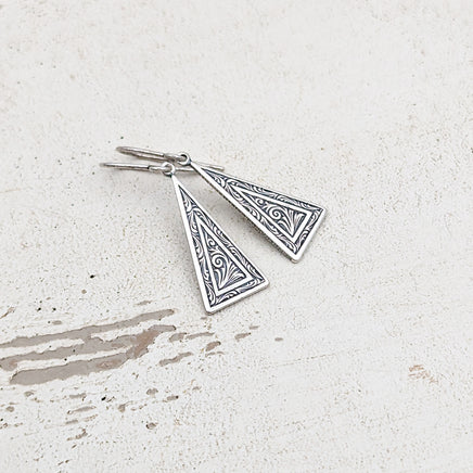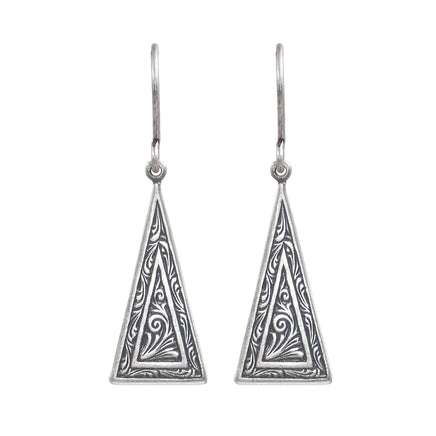 To make these earrings I used beautifully detailed USA-made geometric triangle drops embossed with an antique flourish pattern and oxidized to bring out the details.