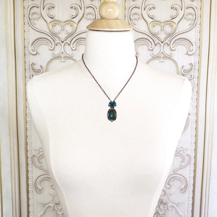 Teal crystals and Czech glass paired with elegant blackened brass. The focal stone is rare Czech glass featuring a mix of blue glass and genuine gold foil, giving it an overall teal color.
