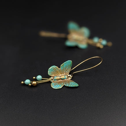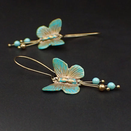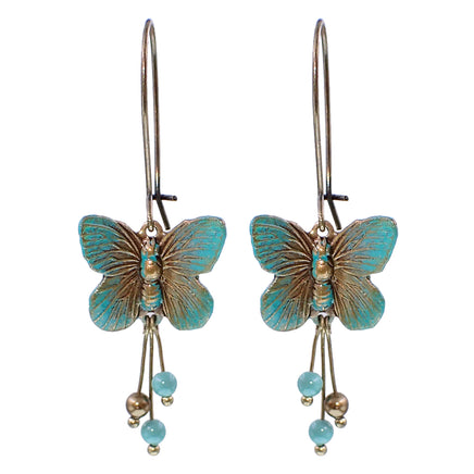 Antiqued brass butterflies hand painted with a faux verdigris patina and then brushed with warm bronze highlights. The earrings feature dangles with crystal pearls and long, dainty kidney-style ear wires.
