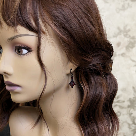 Blackened brass filigree and adornments paired with romantic deepest red Austrian crystal beads.
