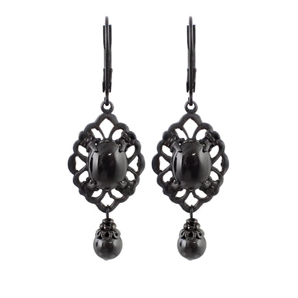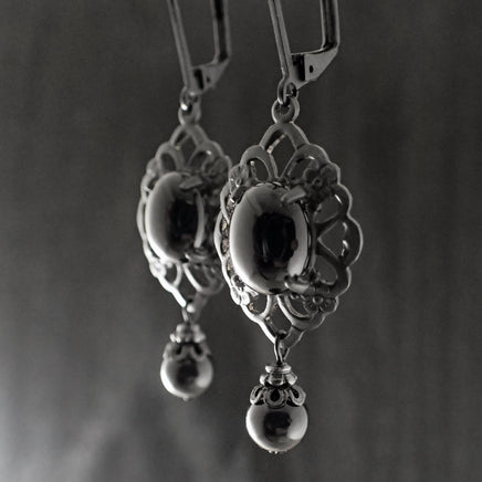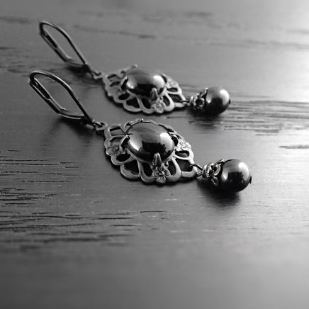 Jet black crystal pearls and Czech glass paired with Victorian Gothic style blackened brass filigree. The filigree features a romantic floral motif.