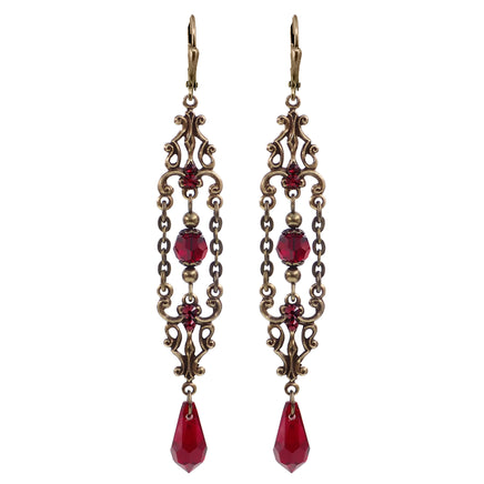 Romantic Victorian style antiqued bronze filigree adorned with blood red crystals. The earrings feature teardrops dangling below like elegant drops of crystallized blood. Perfect for adding a touch of Gothic romance.