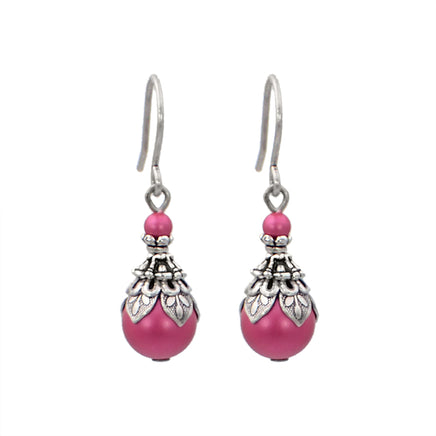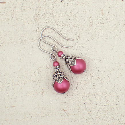 Vivid pink crystal pearls dressed with antiqued silver-colored adornments.