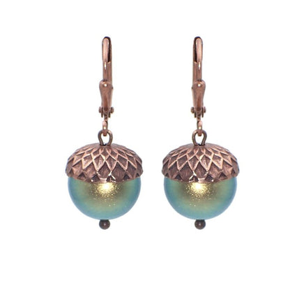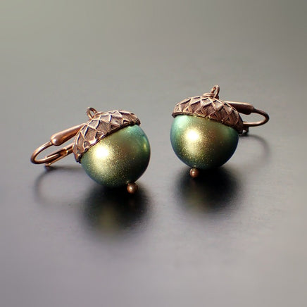 Acorn earrings with antiqued copper metal and iridescent light green crystal simulated pearls