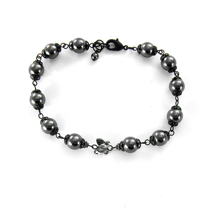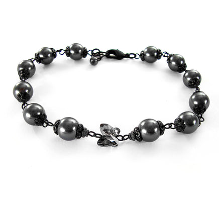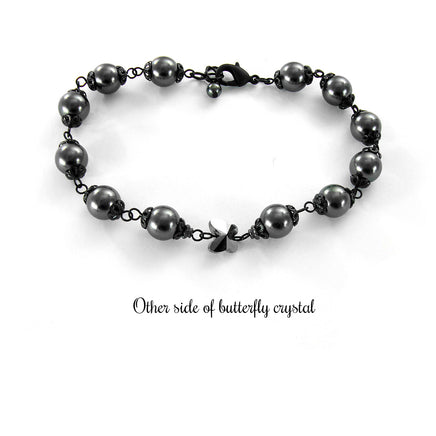 This bracelet features a "Silver Night" crystal butterfly and pearly black crystal simulated pearls. The pearls are adorned with Victorian Gothic style bead caps to enhance the romantic, Old World feel.