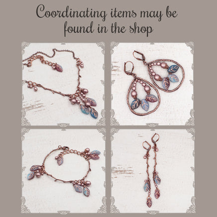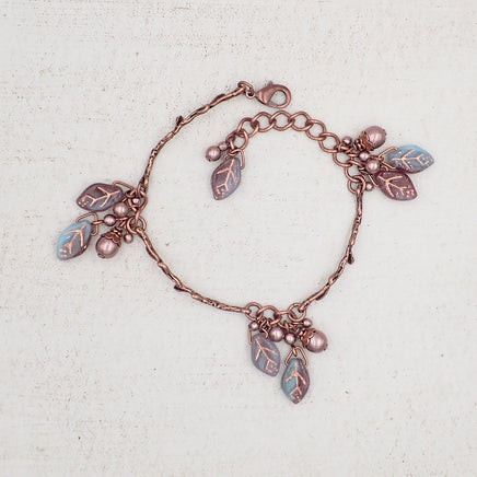 This handmade bracelet features beautifully detailed antiqued copper branches paired with clusters of limited-edition artisan Czech glass leaf beads. Each bead is a swirly mix of transparent purple, transparent teal, and opaque aqua blue glass with a metallic copper wash in the veins of the beads. I finished the clusters with metallic Czech glass faux pearl beads.