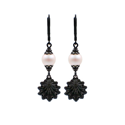 Pearlescent white crystal pearls adorned with blackened brass details and beautifully detailed shells dangling beneath.