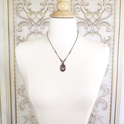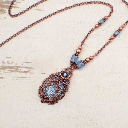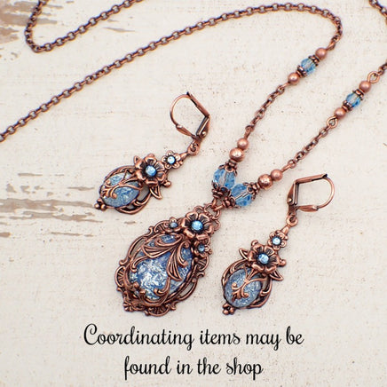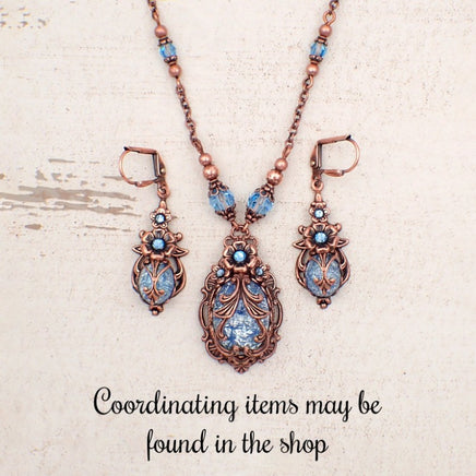 An aqua blue glass faux opal cabochon wrapped in exquisitely detailed antiqued copper filigree. The stone is set in an antique Victorian style setting and adorned with floral elements and coordinating crystals.
