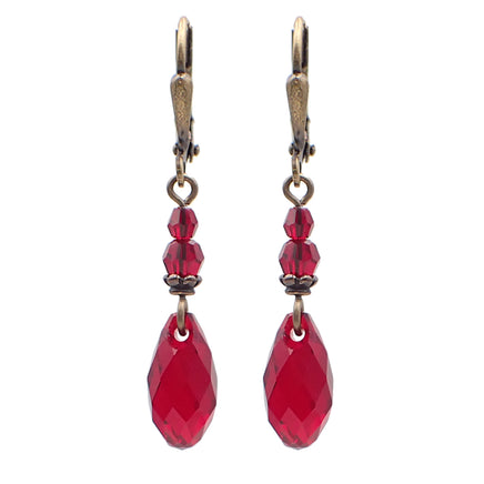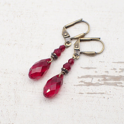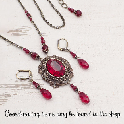 Romantic red crystal drops and beads paired with antiqued brass metal.