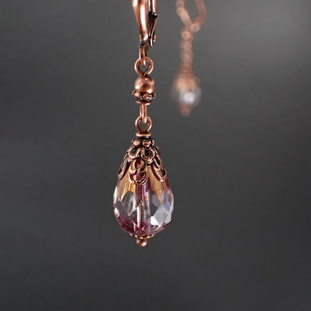 Artisan Czech glass faceted teardrop beads paired with a purple-bronze luster adorned in antiqued copper details.