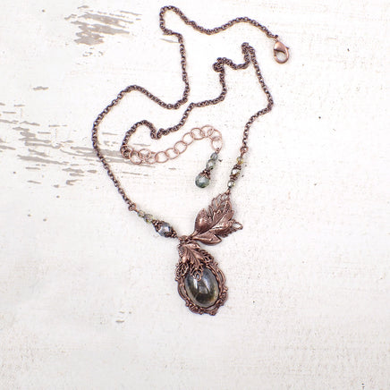 This handmade necklace features rustic green Czech glass wrapped with delicately detailed antique copper leaves.