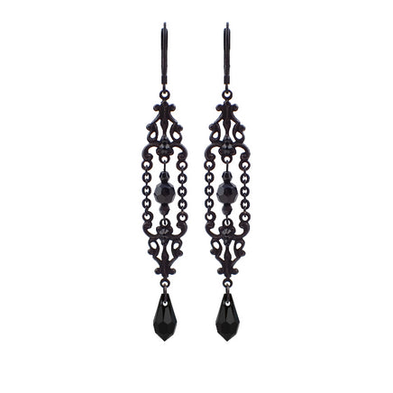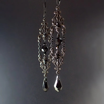 Romantic black crystal beads, drops, and stones paired with sleek black metal filigree and chain.