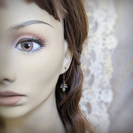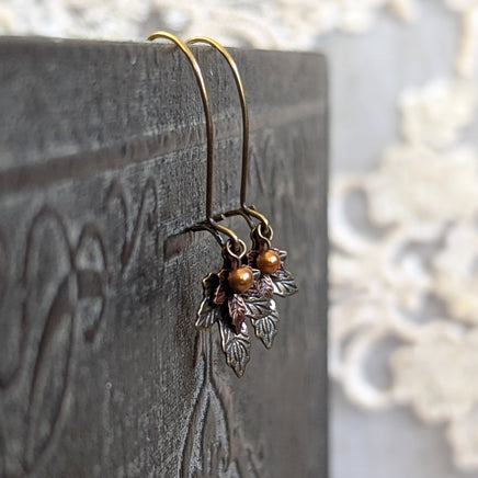 These handmade vintage-inspired Autumn earrings feature lovely little embossed maple leaves in antiqued brass and antiqued copper. A tiny copper-colored Austrian crystal pearl is nestled in the center of the leaves on each earring.