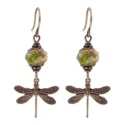Beautifully detailed brass dragonflies with a Victorian floral motif embossed on the wings dangle from artisan rondelles. These rondelle beads are limited edition, made in small batches by the bead masters in the Czech Republic. They are a swirly mix of opaque beige and transparent green glass with a rustic mottled patina on the surface. The beads are adorned with antiqued brass filigree and caps to enhance the Old-World feel.
