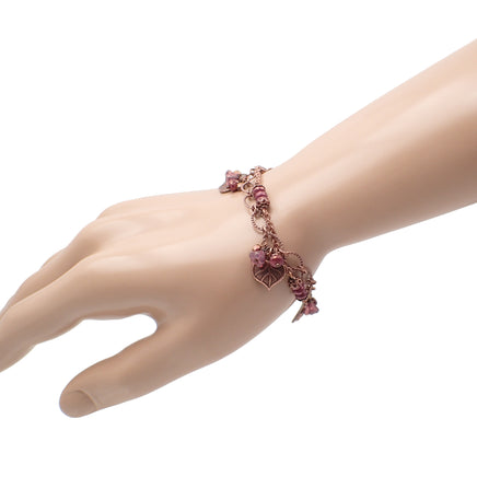 Clusters of pink Czech glass beads and heart-shaped copper leaves along two strands of textured copper chain.