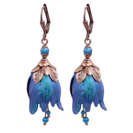 These handmade earrings feature layer upon layer of antiqued copper leafy details atop stunning iridescent tulips featuring a subtle color-shifting patina in shades of blue and teal. The color shifts as the angle from which you view it changes. I finished the earrings with simulated pearls of the same subtly iridescent finish.