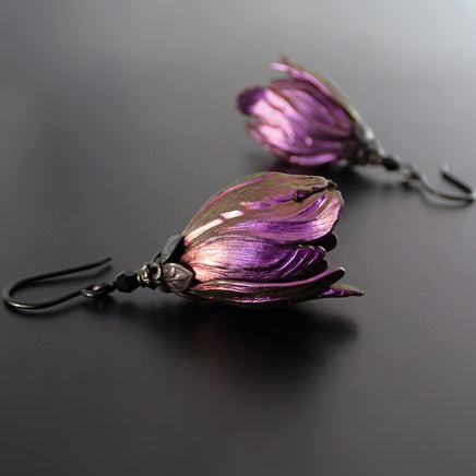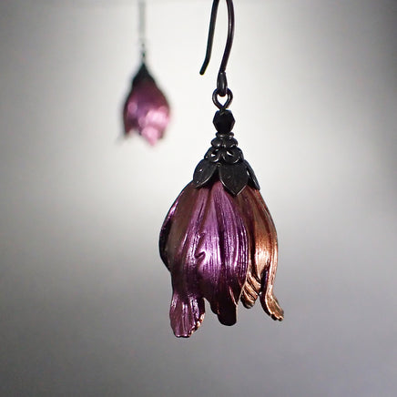 Romantic blackened brass leafy details and jet black crystals adorn dark tulips featuring a color-shifting patina in shades of purple, fuchsia, and orange. The color shifts as the angle from which you view it changes.