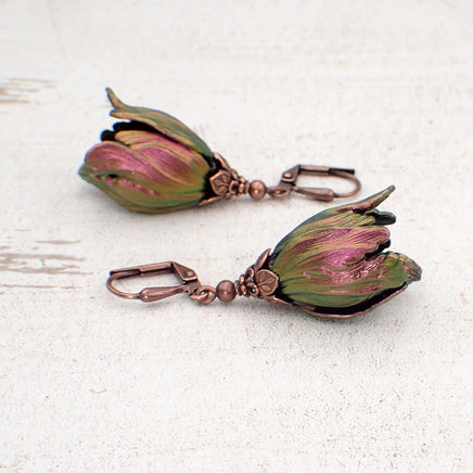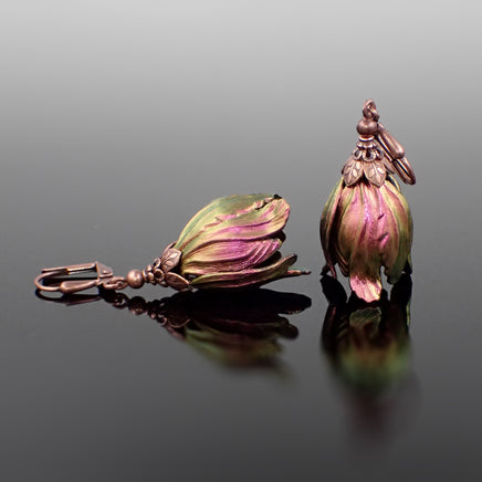 These handmade earrings feature antiqued copper details atop stunning iridescent tulips featuring a color-shifting patina in shades of fuchsia and green. The color shifts as the angle from which you view it changes.