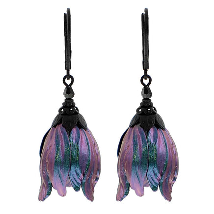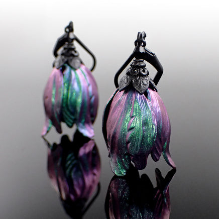 These dark, gothic-inspired flower earrings feature romantic blackened brass leafy details and jet black crystals atop tulip flowers featuring a unique color-shifting patina in shades of purple and green, giving them a whimsical yet dark fairycore vibe. The color on the flowers shifts as the angle from which you view it changes.