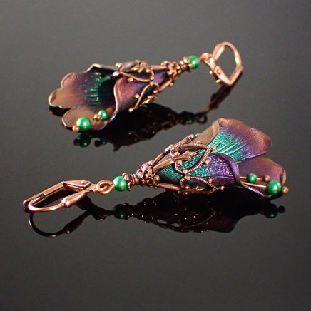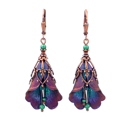 These floral drops feature layers of iridescent hues in purple, green, and reds. The flowers shift colors depending on the angle from which they are viewed. The petals and filigree are rare European brass, topped with green crystal simulated pearls.