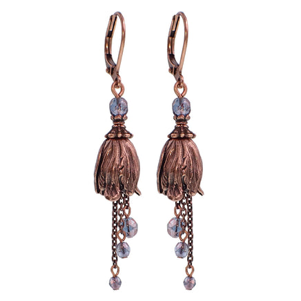 Beautifully detailed antique copper tulips dressed with antique copper adornments. From within the petals dangle tiny lustered amethyst purple beads on dainty antiqued copper chain.