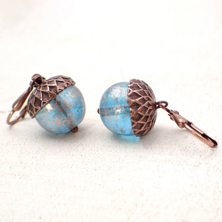 Acorn earrings with Czech glass beads. These rare beads are a transparent aqua blue with a metallic copper patina effect.