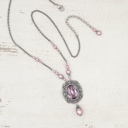 Crystal stone and pearls paired with antique silver Victorian-style filigree. The color of these crystals and pearls is a soft, greyish powdery pink.