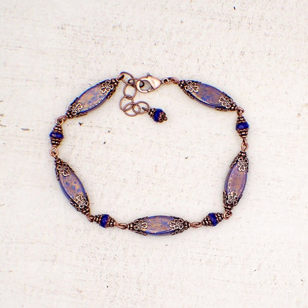 Artisan Czech Glass Beaded Bracelet with Cobalt Blue Beads and Antiqued Copper Details Custom Size