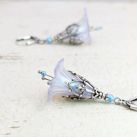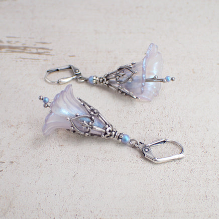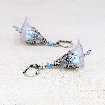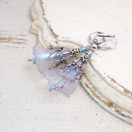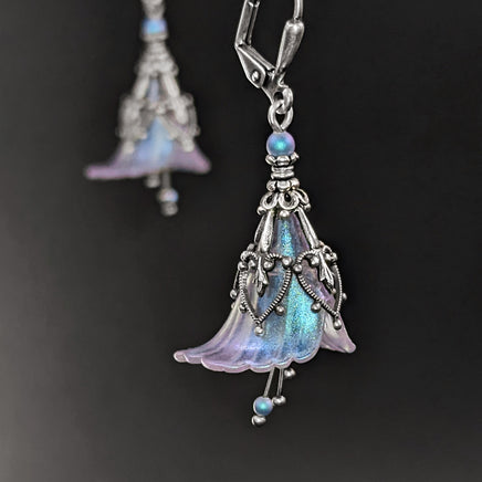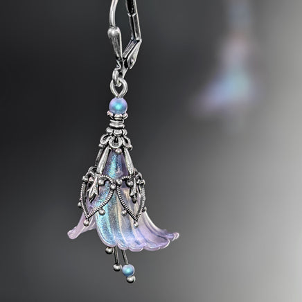 These handmade lucite flower dangle earrings feature an iridescent finish and coordinating iridescent Austrian crystal pearls. I've colored the lucite flowers myself with an intricate process developed in-house to exactly match the finish on the pearls. I adorned the earrings with rare European-made antiqued silver colored filigree and USA-made antiqued silver pewter details. The finish on the flowers is translucent; when light is shining directly on them, the colors appear more saturated and when the light is shining through them, the colors have more of an ethereal shimmer (both effects are shown in the video). The color of the flowers and pearls is an iridescent finish that shifts from light blue to lavender purple, depending on the angle from which they are viewed.