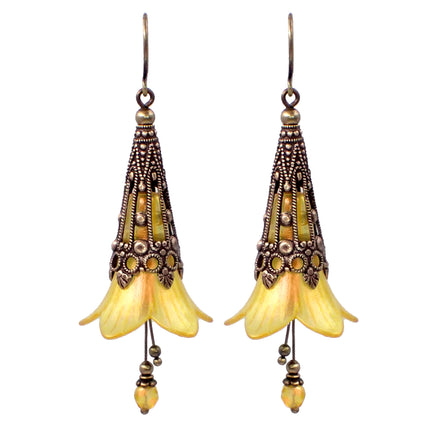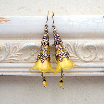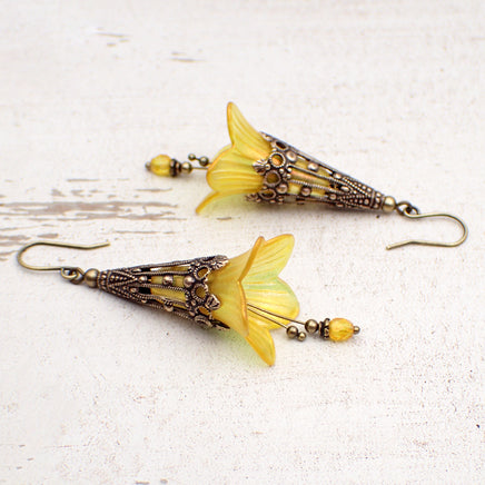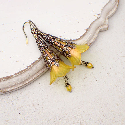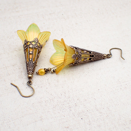 These handmade earrings feature finely detailed antiqued brass floral filigree and lucite flowers, which I gave a translucent, iridescent golden yellow and orange finish. The color of the flowers varies from a deep, rich orange to a bright golden yellow, depending on the angle from which you view them.