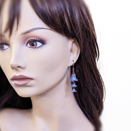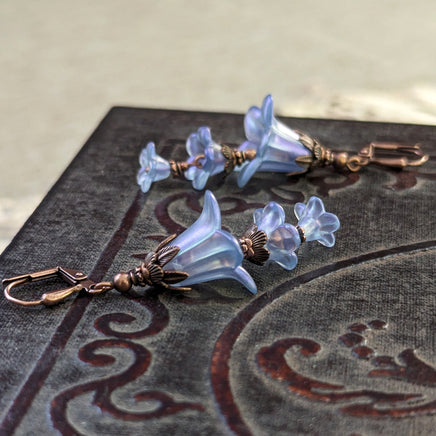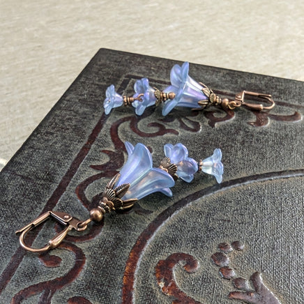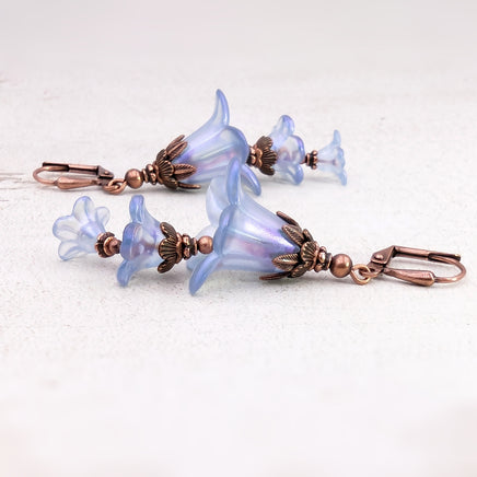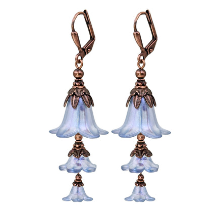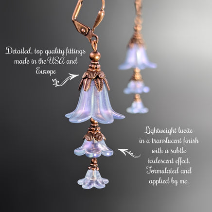 These handmade earrings feature finely detailed antique copper floral details and hand-colored lightweight lucite flowers. Each dangling flower is a step smaller than the one above it with correspondingly smaller adornments and beads. I gave the flowers a translucent light blue finish with a subtle lavender iridescence.
