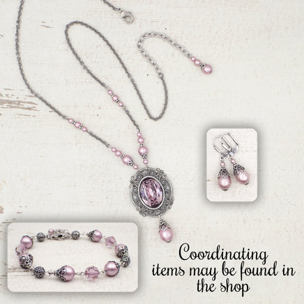Powder Rose crystal pearls dressed with antiqued silver filigree and adornments for an Old-World feel. The beads are an elegant shade of soft, subdued pink.