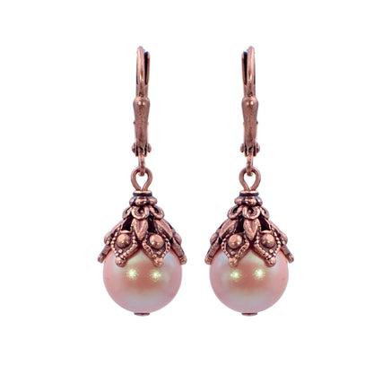 Antiqued copper filigree and adornments paired with shimmery, subtly iridescent light pink crystal pearls.